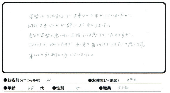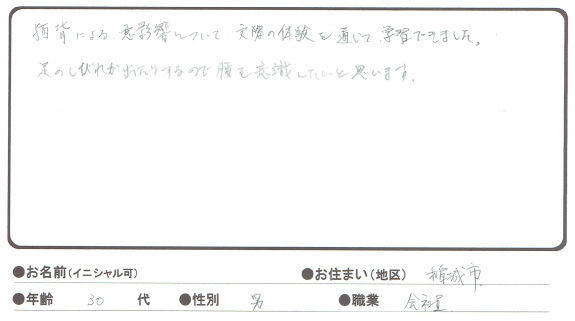 猫背による悪影響について実際の体験を通じて、学習できました。
